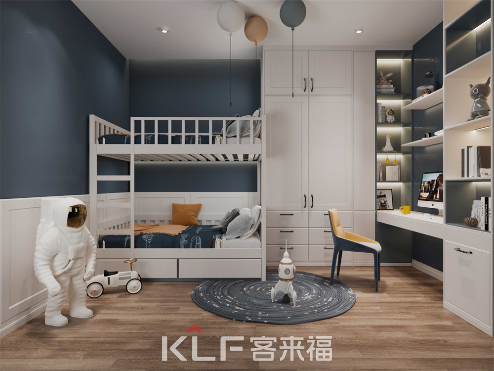 兒童房空間延伸了設(shè)計的色彩主題,不同飽和度的藍(lán)色配合深邃的星空藍(lán),冷靜并充滿思考,L形的設(shè)計也被充分利用。