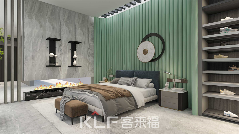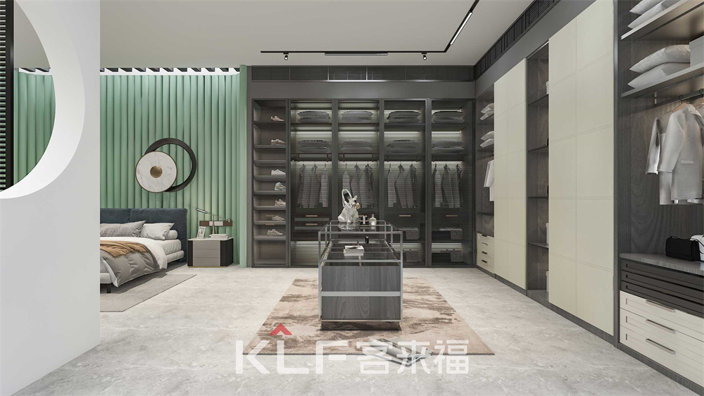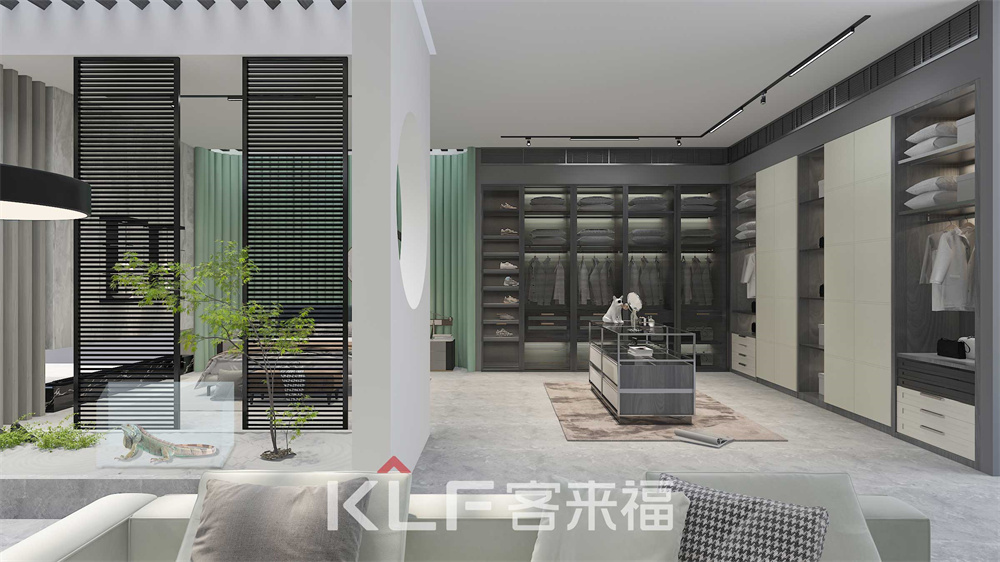 柵欄式背景設(shè)計(jì)塑造空間的線條感,灰色磚紋背景色的搭配加上具有藝術(shù)感的掛件,放大了空間的視覺效果。L型的衣帽間安排,衣帽間皮紋門板的運(yùn)用低調(diào)奢華。采用阻尼軌道,在抽拉時(shí)光滑不受阻,給拉開抽屜時(shí)順滑的享受。