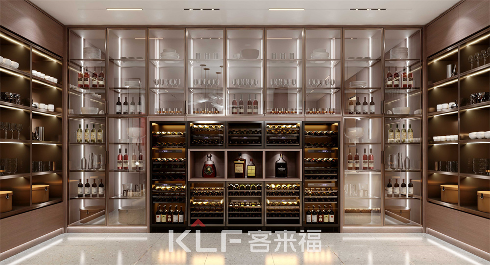 中式酒窖采用了對(duì)稱設(shè)計(jì),左右開放柜,中間運(yùn)用全透明超白玻型材玻璃門,讓酒窖的高端不可言語,彰顯出主人對(duì)酒品的熱愛,對(duì)生活的自由向往。