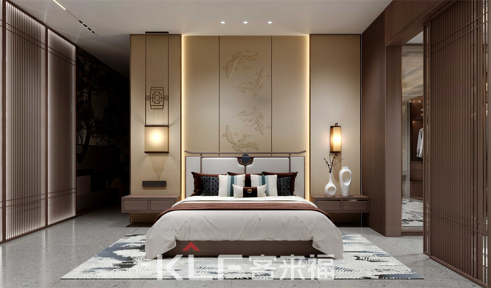 新中式臥室,整體高大整齊,外觀簡(jiǎn)單無復(fù)雜線條。兩側(cè)對(duì)稱床頭柜,兼?zhèn)湫揎椗c臨時(shí)存放功能,搭配低飽和度燈光,營(yíng)造適眠環(huán)境,保障家庭成員的睡眠質(zhì)量。