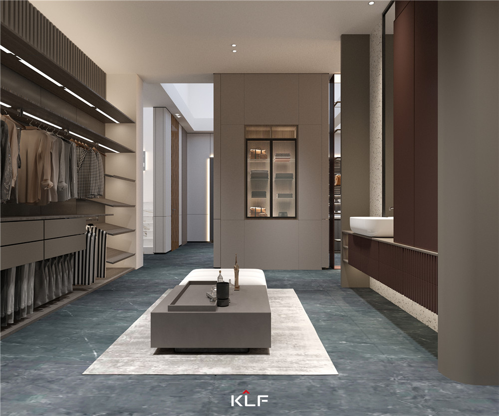 衣帽間采用淺可可同色水漆柜門及墻板,以不同材質(zhì)間的碰撞實(shí)現(xiàn)真正定制!客來福全壁掛式結(jié)構(gòu)的運(yùn)用,讓衣帽間具有奢華感,分功能收納更省心。
